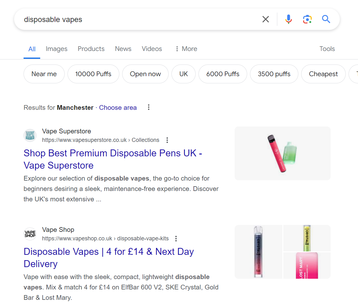 現在、「使い捨て電子タバコ」などの大量キーワードで上位にランクされている Vape Superstore のような Web サイトにとって、SGE の潜在的な影響は重大である可能性があります。 検索リストに Google 広告が表示されない場合、CTR は 45% に達する可能性があるため、この不動産を AI 主導の SGE 結果で複製すると、PPC または有料ソーシャルのバックアップ オプションが利用できない場合、CTR に大きな影響を与える可能性があります。