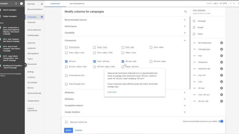 - 「キャンペーン」タブに移動し、列アイコンをクリックします。