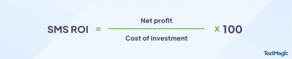 SMS マーケティングに関して言えば、ROI の計算は簡単です。 これは、純利益を投資コストで割ることによって行うことができます。 次に、結果に 100 を掛けます。数学的には、次のようになります。