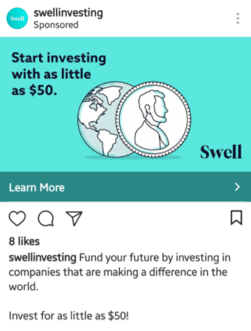 金融サービスとインパクト投資のプラットフォームである Swell は、投資後のクリック ランディング ページを使用して、顧客ベースと資金を拡大しています。 同社はまた、さまざまなプラットフォーム (Google、Facebook、Instagram など) でのリマーケティングを使用して、関連する見込み客に広告を表示し、専用のポスト クリック ランディング ページに誘導しています。