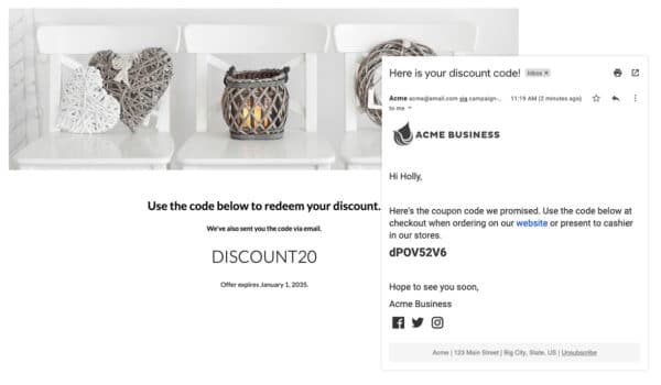 クーポンを一意のコードとして生成すると、クーポンの引き換えと各ユーザーの行動を追跡できます。 この情報は、関心のあるトピックや製品に関するデータを使用して、将来的に各個人のマーケティング エクスペリエンスをパーソナライズするのに役立ちます。