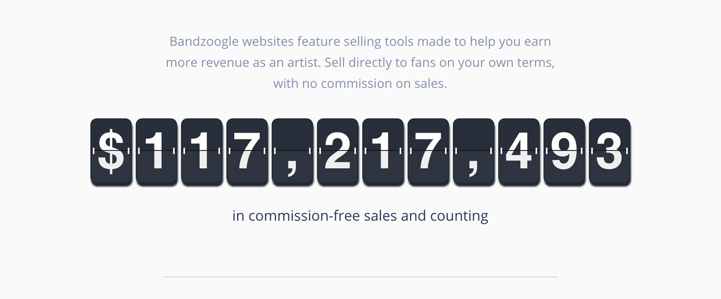 2023 年は、Bandzoogle メンバーにとって大盛況で始まりました。 私たち全員が Bandzoogle の売上ティッカーに注目し、より多くのミュージシャンがより多くのグッズや音楽を販売するにつれて、会員ウェブサイトを通じての売上高は 1 億ドルの基準を超えました。 すべて手数料無料で、そのお金はすべてアーティストに直接寄付されます。