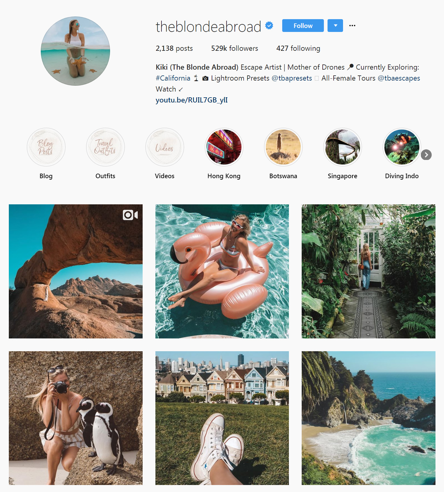 過去6年間で、Tuffenは、270万人以上のフォロワーを抱える、TravelInstagramの最大のインフルエンサーとして驚くべき進歩を遂げました。 関連するコンテンツを一貫して視聴者に提供するために、彼女は定期的にブランドと協力して、観光キャンペーン、スポンサー付きの投稿、イベントなどを宣伝しています。 彼女の元気な性格とアニメーション化されたInstagramプロフィールは、彼女に69のインフルエンサースコアを獲得しました。