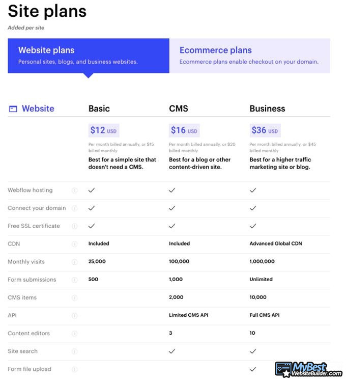 価格は、ビルドツールのレビューの最後に私が常に参照するものです。 さて、Webflowのコストに関しては、最初に説明します。このビルダーは安くはありません。 Webflowは多くの異なるサービスプロバイダーから機能するハイブリッドツールキットであるため、標準のWebサイトビルダーよりも少し高い金額を支払うことが期待できます。