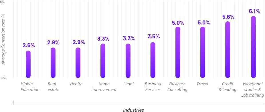 さらに、レポートが強調しているように、最もコンバージョン率の低い業界は2.6%の高等教育であり、最もコンバージョン率の高い業界は、6.1%のコンバージョン率の職業研究と職業訓練です。