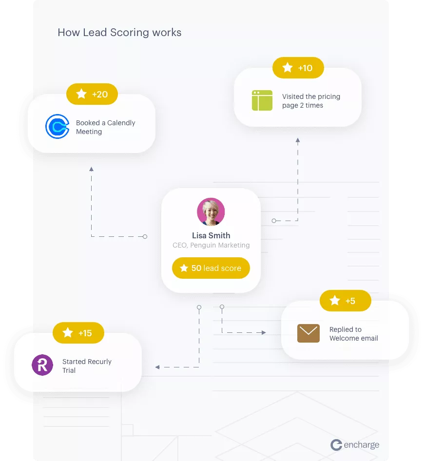 たとえば、Enchargeを使用すると、少なくとも100件の連絡先をインポートし、少なくとも1つのフローをアクティブ化したユーザーがコンバージョンに至る可能性がはるかに高いため、フローを開始するすべてのトライアルアカウントに10ポイントを割り当てることができます。
