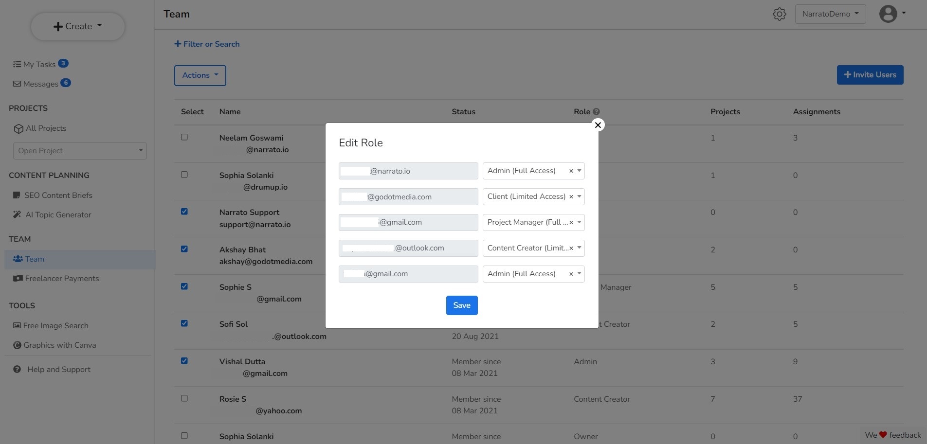 製品主導のアプローチでコンテンツ作成プロセスを管理するには、コンテンツチームのコラボレーションを強化する必要があります。 この場合、優れたコンテンツコラボレーションプラットフォームは必須です。 Narratoを使用して、しばらくの間、製品チームや技術チームと相談してコンテンツを作成してきました。ドキュメント、メール、チャットを行ったり来たりするよりも、単一のプラットフォームで共同作業する方がはるかに簡単であることに気づきました。 すべてのチームメンバーをプラットフォーム上のさまざまな役割のユーザーとして追加し、必要に応じてコンテンツプロジェクトにカスタムアクセスできるようにしました。