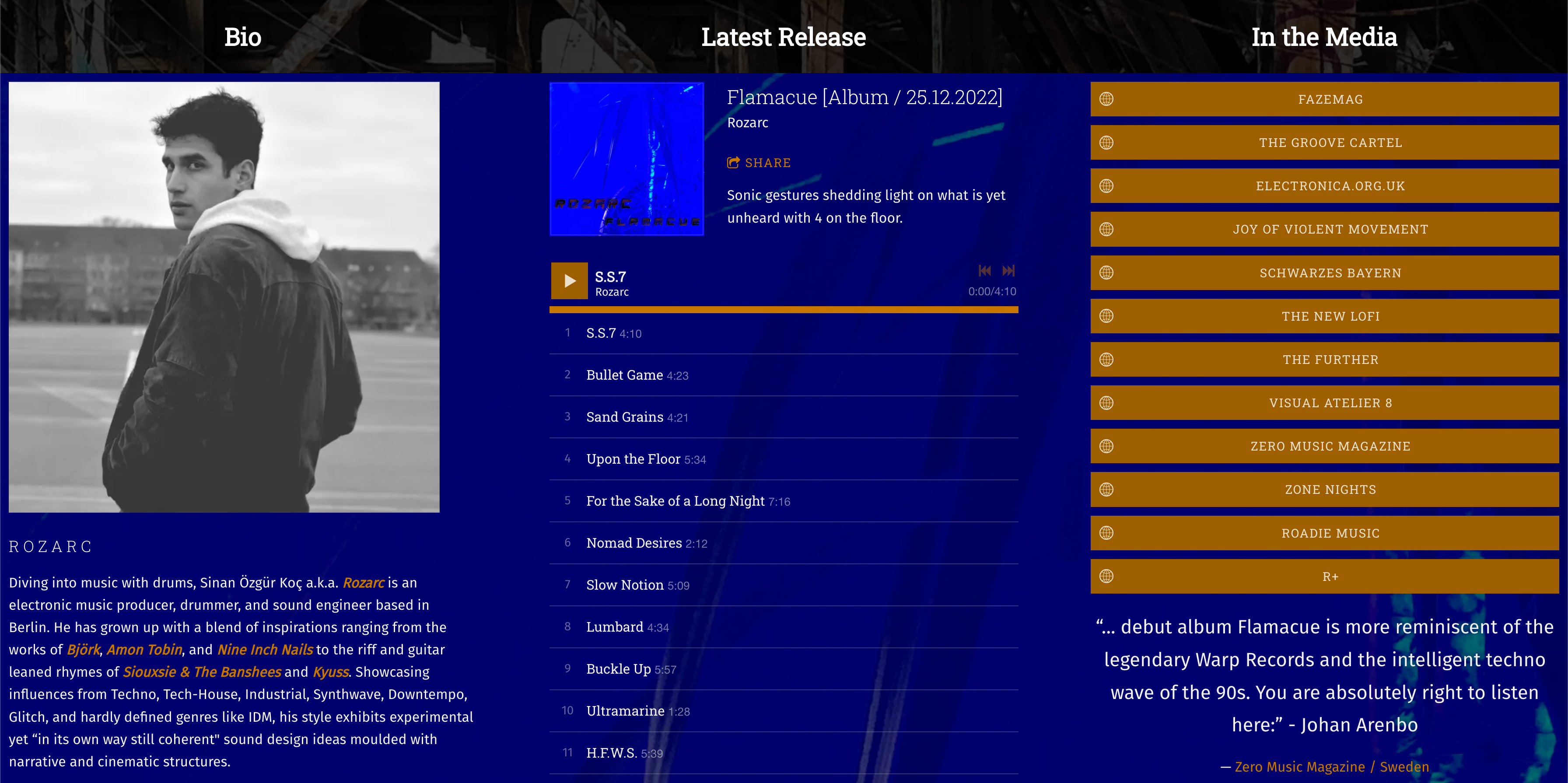 EPK에 스마트 링크 기능을 포함시키는 것은 팬과 업계 전문가가 온라인에서 프로젝트 리뷰를 찾는 데 도움이 되는 좋은 방법입니다. 전자 음악 프로듀서 Rozarc는 언론 사진, 잘 작성된 약력, 음악 플레이어, 그리고 이전 출시 주기의 주요 언론에 쉽게 연결되는 스마트 링크 기능을 포함하는 EPK를 만들었습니다. 업계 전문가에게 라이브 쇼 리뷰를 제공하여 귀하의 화제가 무엇인지 확인할 수 있는 좋은 방법입니다.