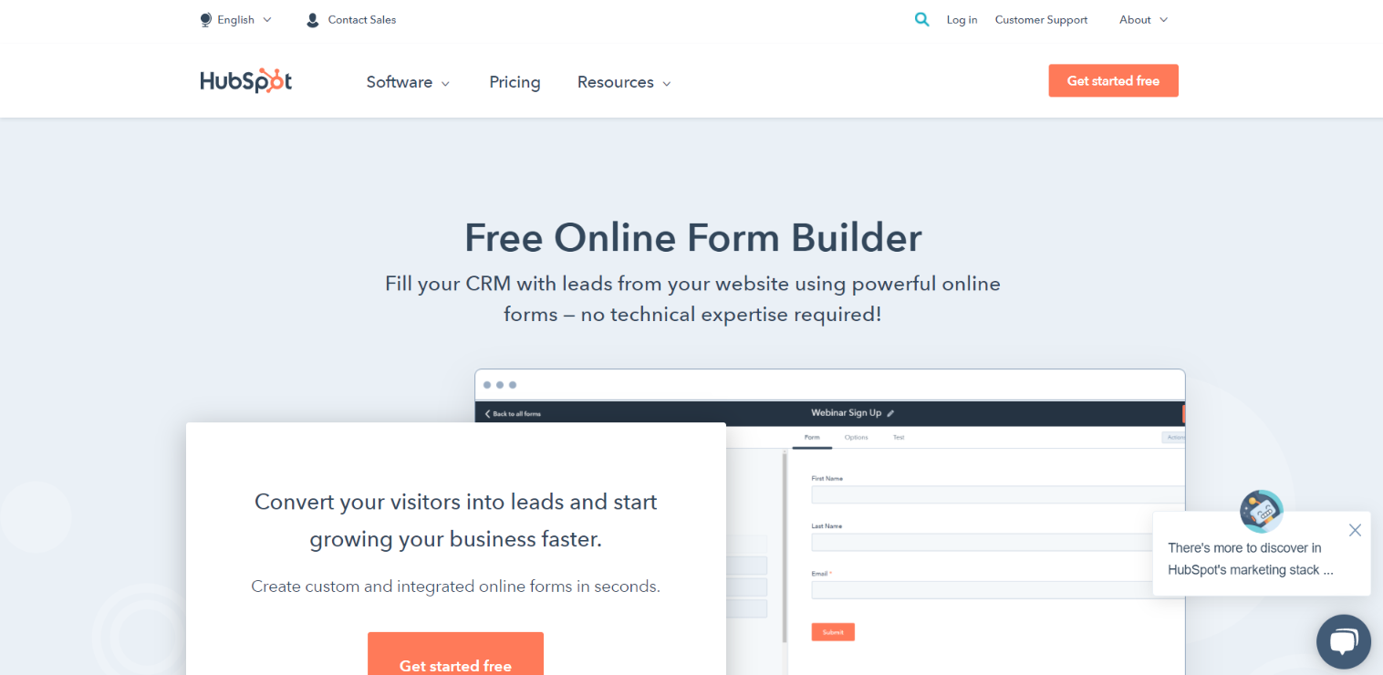 인기 있는 인바운드 마케팅 및 판매 소프트웨어 HubSpot은 웹 사이트용 무료 온라인 양식 작성기를 제공합니다. 최대 1,000개의 양식 필드가 있는 사용자 정의 양식을 만들 수 있습니다. HubSpot의 폼 빌더는 인터페이스가 단순하므로 기술적 전문 지식이 필요하지 않습니다.