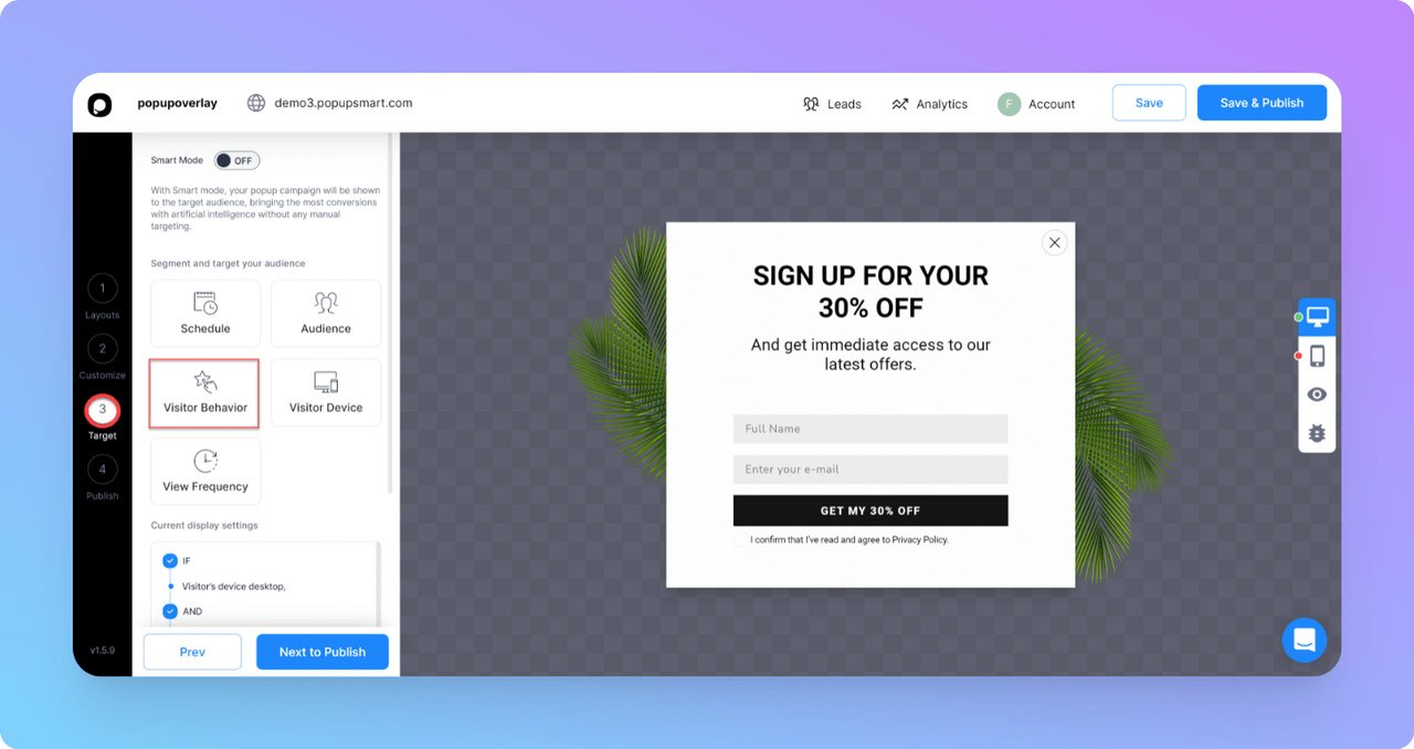 6- 그런 다음 "대상" 섹션으로 이동할 수 있습니다. 여기에서 팝업의 대상 고객, 일정 세부 정보, 방문자 행동, 방문자 장치 및 보기 빈도를 선택할 수 있습니다.