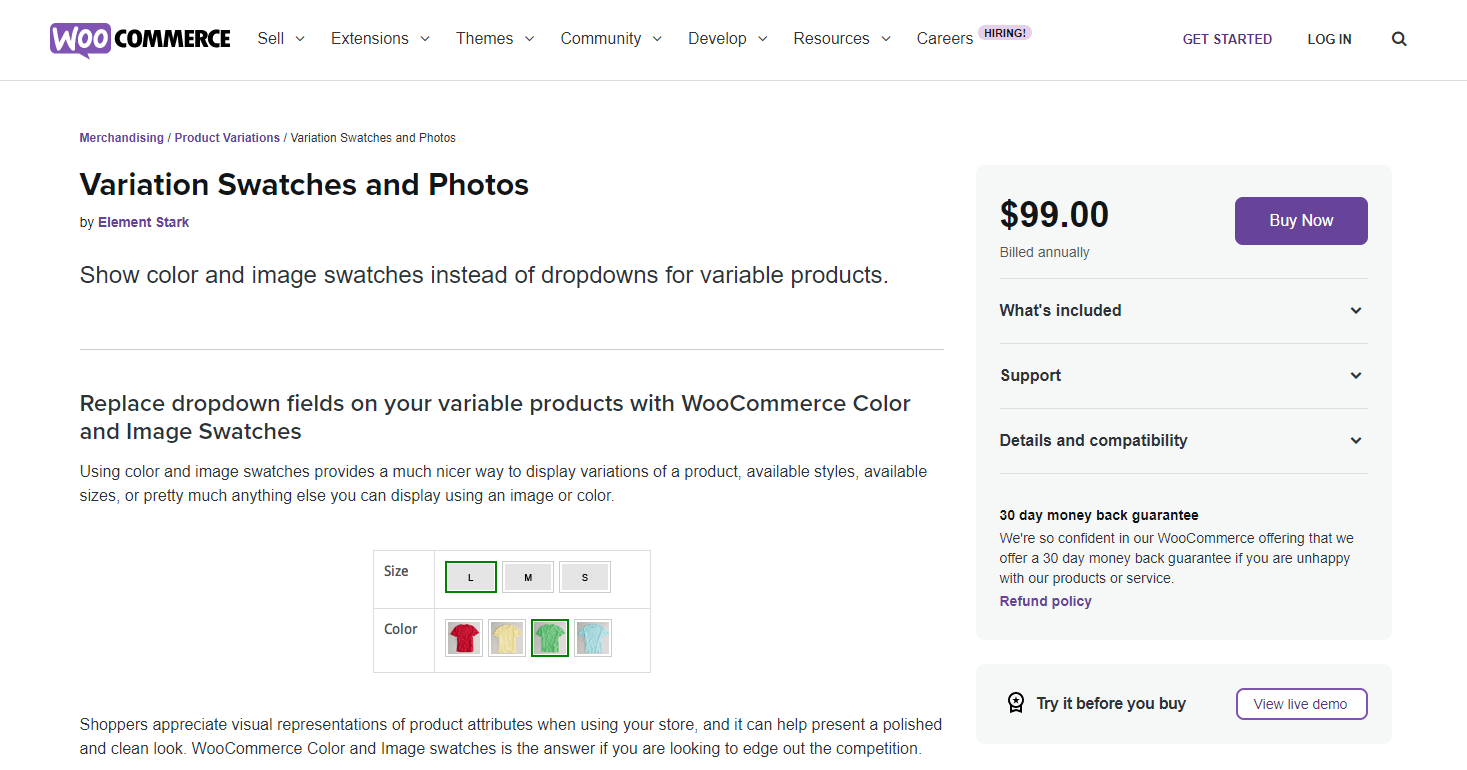 가격 : 변형 견본 및 사진 플러그인은 연간 99달러로 모든 WooCommerce 비즈니스에 적합합니다.
