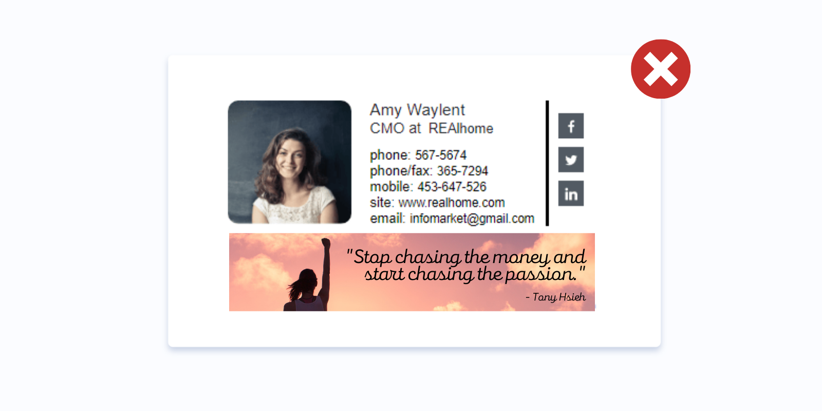 개인 브랜드를 대표하는 경우 서명에 자신의 사진을 추가해야 합니다. 다정하고 편안한 표정의 헤드샷은 완벽한 선택이 될 것입니다.