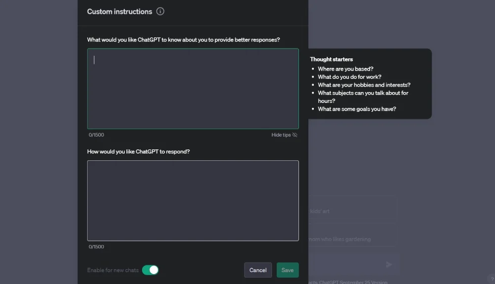 ChatGPT에 새로 도입된 기능은 사용자 지정 지침입니다. 이를 통해 ChatGPT는 입력된 개인 또는 비즈니스 세부 정보를 기반으로 개인화된 응답을 생성할 수 있습니다. 또한 맞춤형 지침을 통해 AI를 교육할 수 있습니다. 맞춤 지침에 추가할 수 있는 세부정보는 다음과 같습니다.