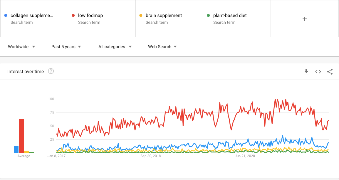 다음은 강력한 성장을 경험하고 있는 건강 식품 부문의 일부 미시적 틈새 시장입니다(Google 트렌드에 따름).