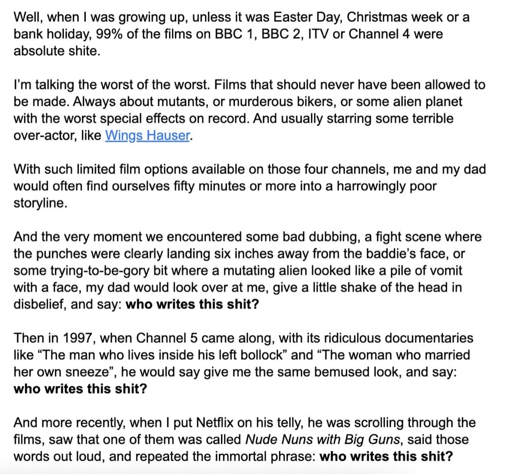 이것은 Daniel Throssel의 환영 이메일에서 가져온 작은 스니펫입니다. Daniel의 매력적이고 설득력 있는 스타일은 호주 최고의 카피라이터라는 자칭 타이틀을 정당화합니다.