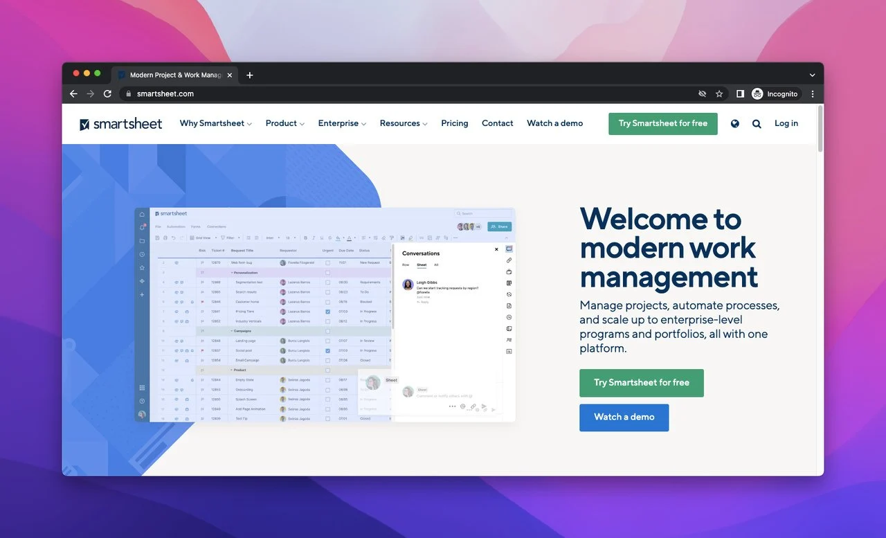 Smartsheet는 사용자에게 다양한 솔루션을 제공하는 작업 관리 플랫폼입니다. Smartsheet의 기능에는 자동화, 브리지, 사용자 지정 이메일 도메인, 리소스 관리, 콘텐츠 공동 작업 및 추가 기능이 포함됩니다.