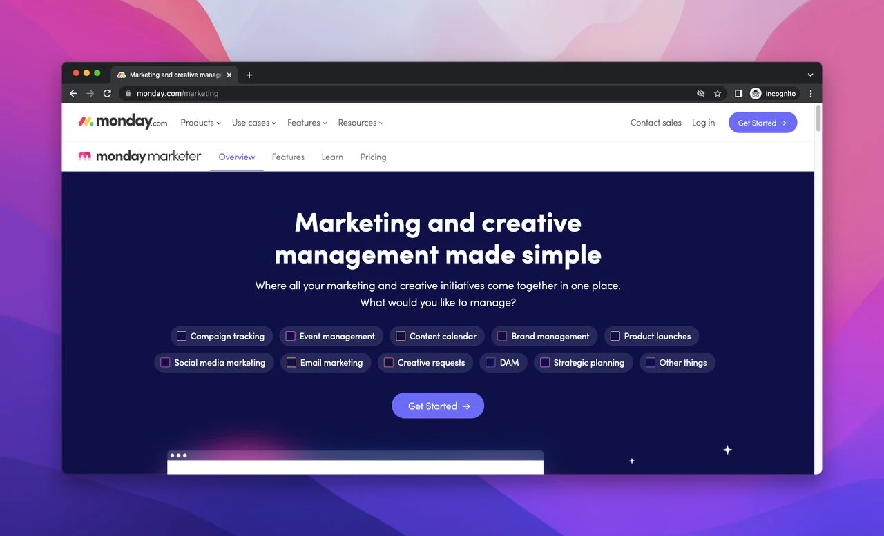 Monday.com에는 마케팅 워크플로 도구를 제공하는 Monday Marketer 라는 기능이 있습니다. 마케팅 및 창의적인 활동을 보다 쉽고 효율적으로 만듭니다. 콘텐츠 캘린더, 이메일 마케팅, 소셜 미디어 마케팅, 이벤트 관리, 브랜드 관리 등 많은 마케팅 워크플로 템플릿이 있습니다.