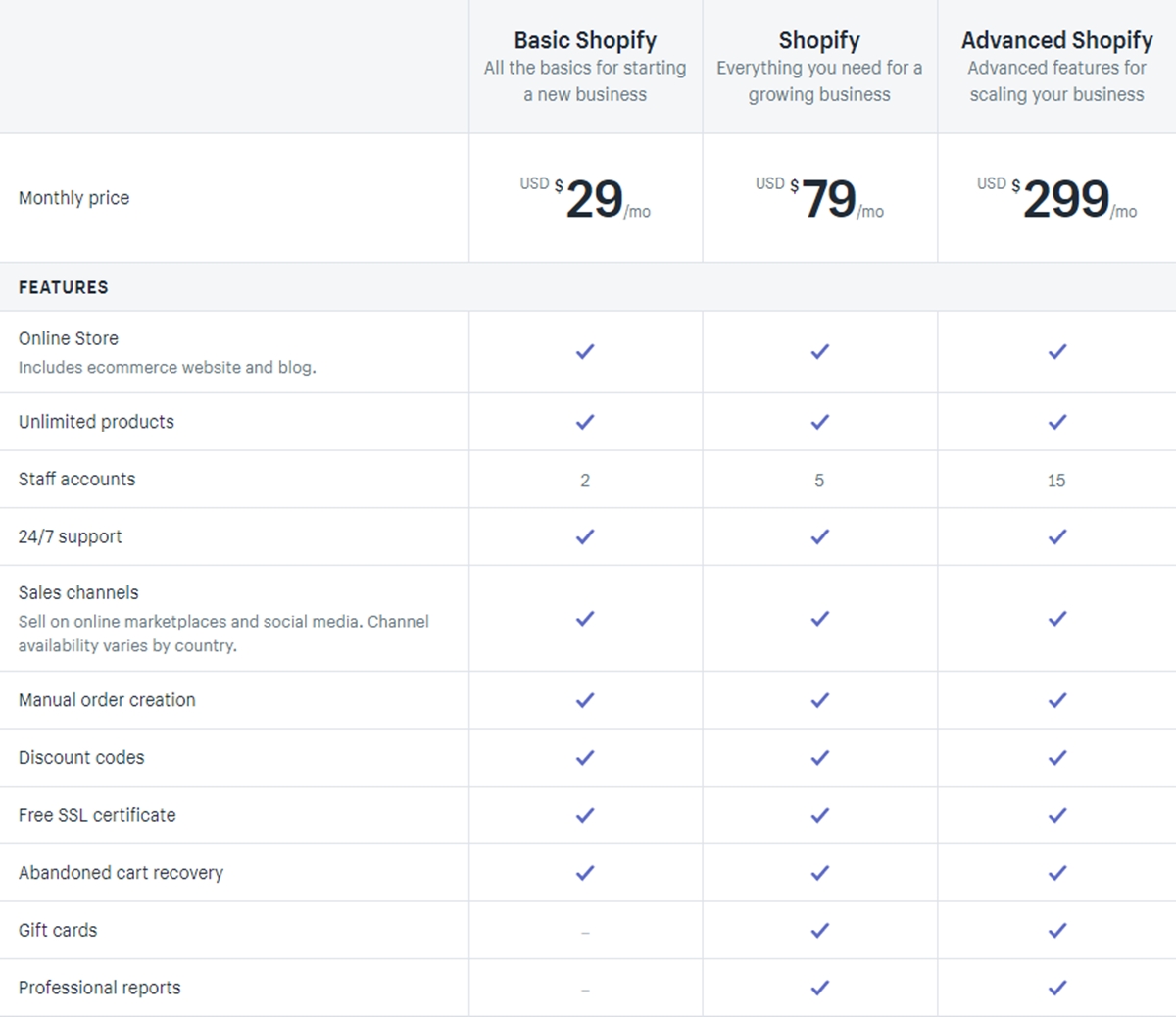 수수료는 Shopify 가격 책정 페이지에서 매우 투명하므로 여기에서 많은 세부 사항을 설명할 필요가 없습니다. 다음 섹션으로 가자.
