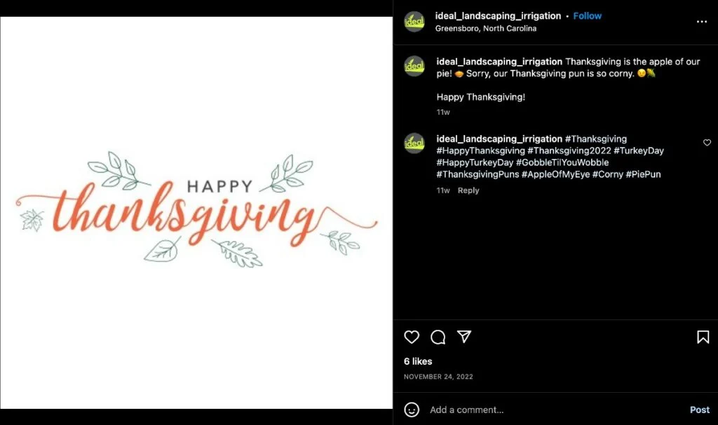 재치 있는 유머는 요즘 소셜 미디어에서 인기를 끌고 있습니다. 추수감사절 소셜 미디어 아이디어에 추수감사절 말장난과 전문 용어를 포함하세요. 순례자, 도토리, 메이플라워 또는 가장 일반적인 것(중식, 중식)은 어떻습니까? 사람들이 검색할 수 있도록 해시태그로 사용하세요.