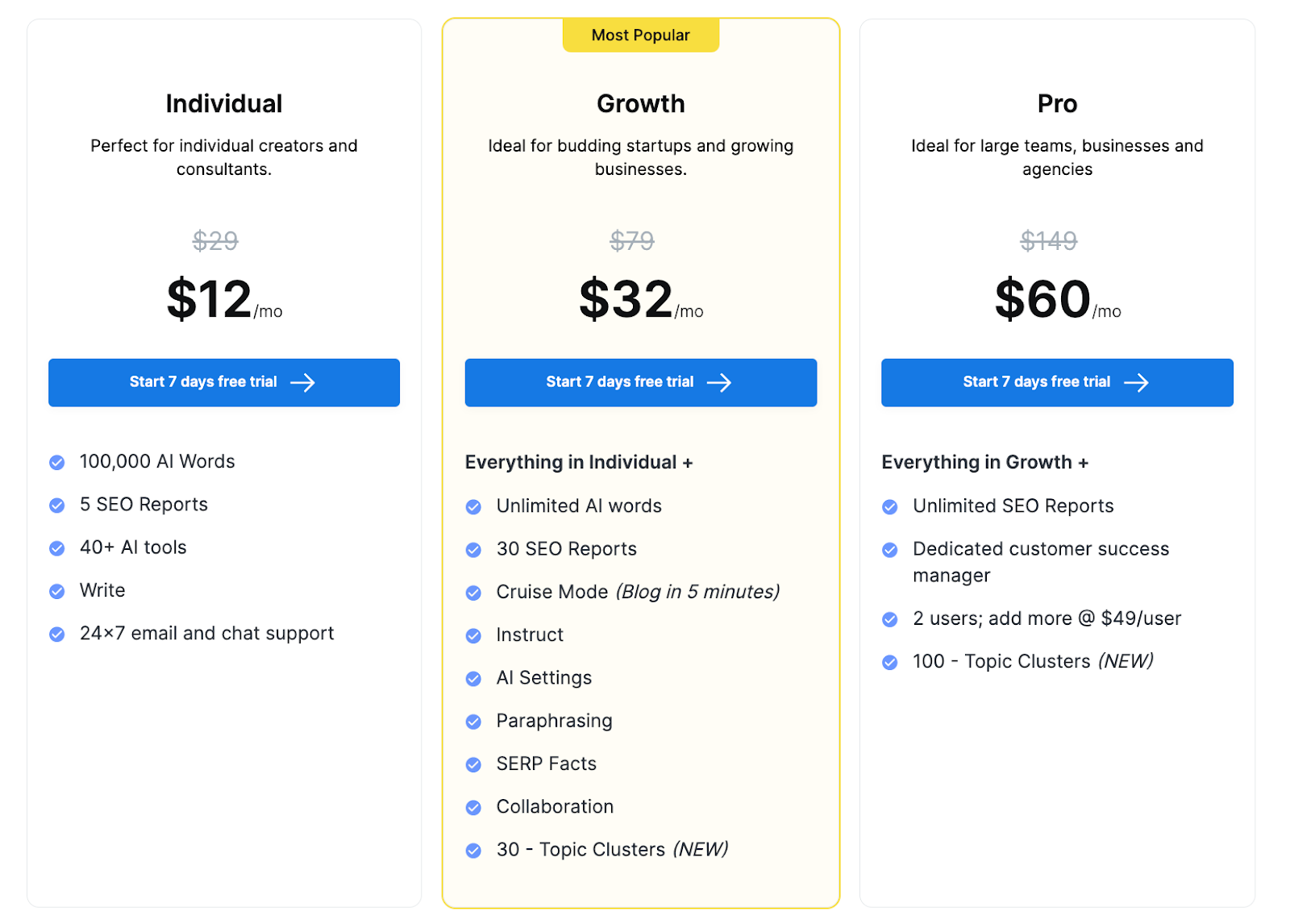 - 개별 요금제를 사용하면 월 $12 에 5개의 SEO 보고서를 만들고 한 달에 100,000개의 AI 단어를 생성할 수 있습니다. 이 계획은 한 달 동안 많은 콘텐츠 요구 사항이 없는 개인 및 컨설턴트에게 적합합니다.