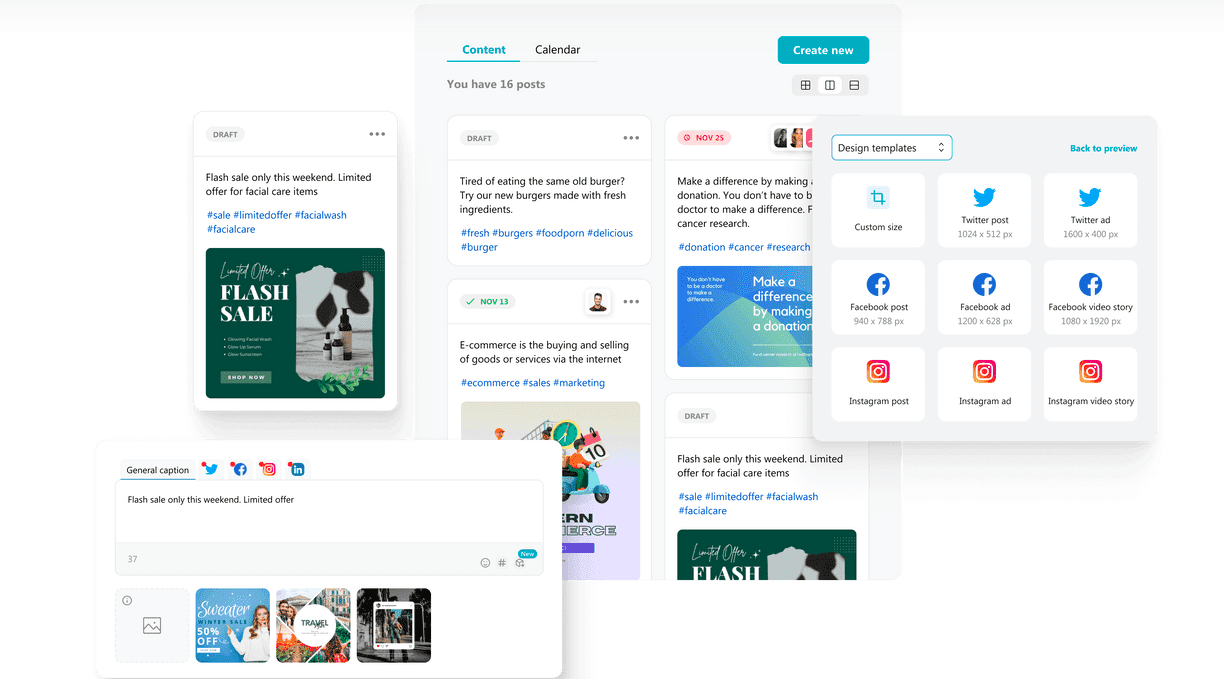 - Szeroka gama gotowych szablonów treści do mediów społecznościowych na Instagram, Facebook, LinkedIn i inne platformy mediów społecznościowych