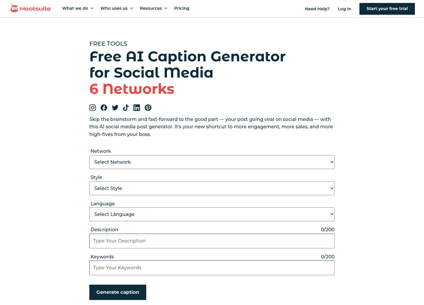 Generator napisów AI firmy Hootsuite dla mediów społecznościowych