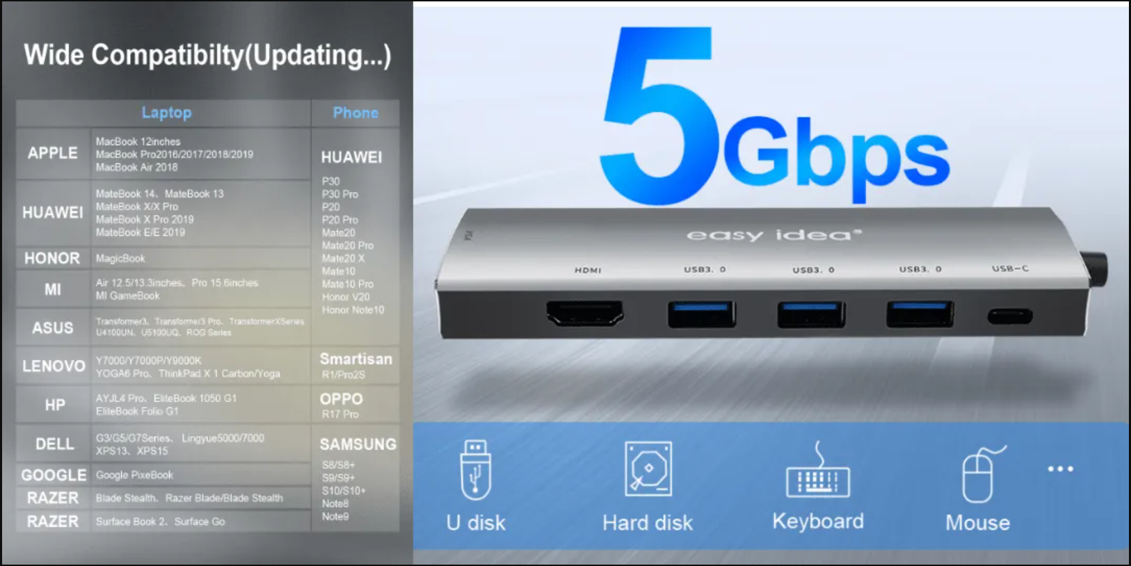 Hub USB to w zasadzie urządzenie z wieloma portami, które umożliwia podłączenie 3 portów USB, USB-C, HDMI i VGA do komputera Mac i innych laptopów z prędkością transmisji 5 Gb/s. Można podłączyć klawiaturę, mysz, dysk twardy, USB-U do MacBooka lub laptopa, a nawet smartfony i tablety. Rozdzielczość 4K zostanie dostarczona do telewizora, monitorów i projektorów. Ogólnie rzecz biorąc, jest dostępny w wielu opcjach do wykorzystania.