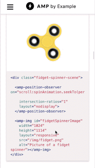 Animacja związana z przewijaniem może ożywić obrazy, gdy użytkownik przewija Twoją stronę. Weźmy na przykład ten fidget spinner zbudowany z AMP, który obraca się, gdy użytkownik przewija.