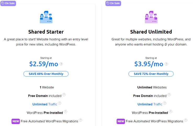 - Plan Shared Starter zaczyna się od 5,59 USD miesięcznie (rozliczane co roku) — jest to idealne rozwiązanie dla mniejszych witryn lub dopiero tworzących blogów.