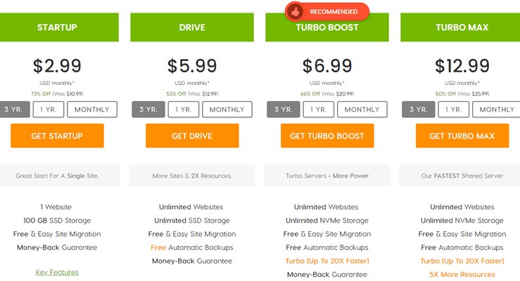 - Plan Turbo: Ten najwyższej klasy pakiet zaczyna się od 5,99 USD miesięcznie. Zapewnia maksymalną prędkość dzięki integracji technologii buforowania LiteSpeed, dzięki czemu Twoja witryna ładuje się szybciej niż kiedykolwiek wcześniej.