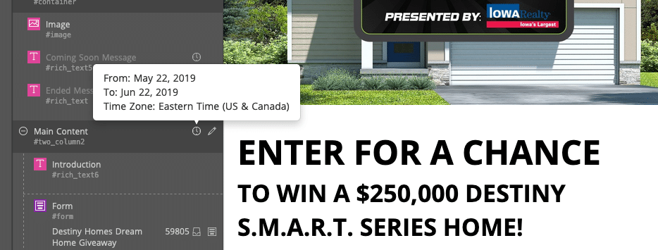 Iowa Realty zaprezentowała prezentację Dream Home z serii Destiny Homes SMART. Celem kampanii było promowanie świadomości marki, zwiększenie zaangażowania społecznego i cyfrowego oraz stymulowanie pozyskiwania danych klientów (leadów). Wśród nagród znalazł się dom z serii Destiny SMART Series o wartości 250 000 USD, Chevrolet Silverado z 2019 r. oraz nagroda pieniężna w wysokości 10 000 USD. Bycie budowniczym domu, oddanie domu jako głównej nagrody ma wiele sensu. Ale poczekaj chwilę! Nowy dom? To ogromna inwestycja w zebranie potencjalnych klientów i podniesienie świadomości marki. Tu właśnie pojawiły się inteligentne partnerstwa z NASCAR i Iowa Speedway.