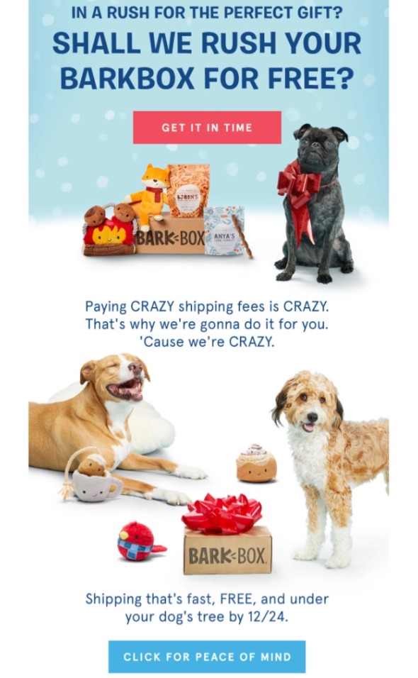 Znany ze swoich uroczych, wypełnionych szczeniakami e-maili, BarkBox udowadnia, że jesteś w stanie dotrzeć do kupujących w ostatniej chwili, będąc jednocześnie pomocnym.