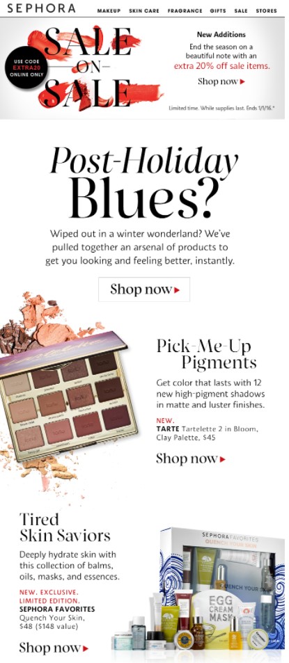 Gdy wakacje się kończą, nie oznacza to, że powinieneś przestać wysyłać e-maile. Zamiast tego rozważ wysłanie swoim subskrybentom kilku ofert „poświątecznych”, aby uzyskać większą sprzedaż i zachęcić konsumentów, którzy otrzymali karty podarunkowe, do rozpoczęcia z nich korzystania.