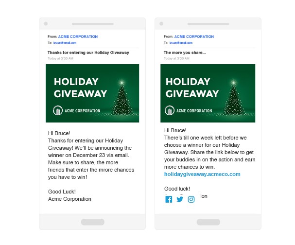 Konkursy/Prezenty to świetny sposób na świętowanie świąt z największymi fanami. Ten e-mail powinien koncentrować się na bieżącym konkursie świątecznym/prezentach lub promocji, a nie na sprzedaży. Powinien również: