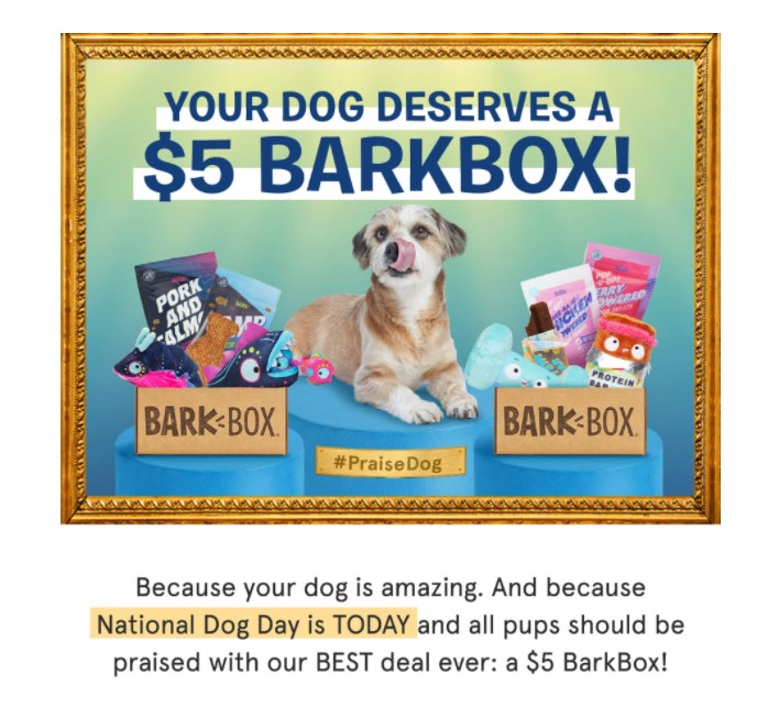 Wykraczając poza zwykły przekaz okolicznościowy, marka prowadzi specjalną kampanię z okazji „Narodowego Dnia Psa”, a następnie obniża cenę swoich pudełek do 5 USD. Biorąc pod uwagę, że firma jest miesięcznym abonamentem dla psów, wybór tego dnia ma sens.