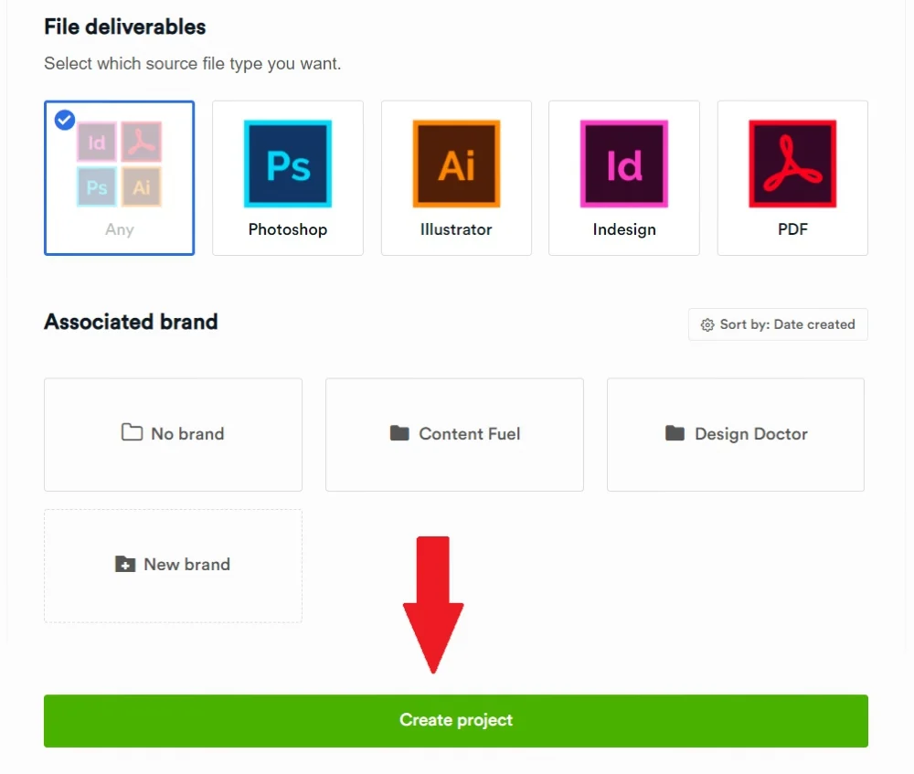 Po zakończeniu wybierz poziom dostosowania, pliki i powiązaną markę. Gdy już to zrobisz, kliknij Utwórz projekt i gotowe!