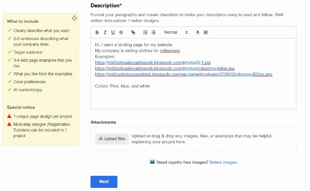 Tutaj będziesz opisywać swój projekt. Możesz być tak prosty lub skomplikowany, jak chcesz. Ale im więcej szczegółów podasz, tym lepiej projektant będzie mógł zaprojektować stronę docelową tak, aby pasowała do Twojej wizji.