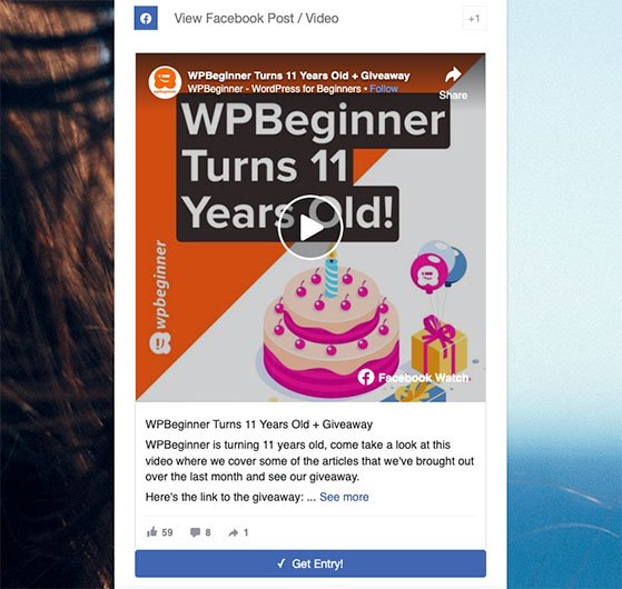 Możesz wykorzystać akcje promocyjne RafflePress na Facebooku do organizowania takich konkursów. Na przykład możesz zacząć od akcji Wyświetl post na Facebooku/wideo, która umożliwia osadzenie posta na Facebooku bezpośrednio w widżecie prezentów.