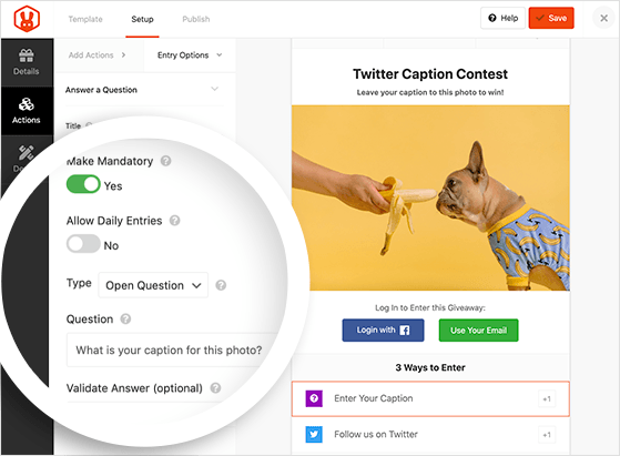 Akcja Odpowiedz na pytanie RafflePress jest idealna do tego typu zawodów. Możesz nawet przeprowadzić konkurs głosowania uzupełniającego, korzystając z akcji Ankiety i ankiety, aby poprosić fanów o wybranie swojego ulubionego imienia.