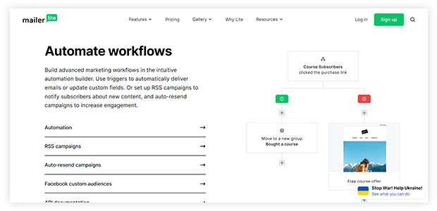 MailerLite é uma plataforma de automação de e-mail marketing. Possui um painel intuitivo e facilita o marketing avançado por meio de sua segmentação. Ele permite que você configure campanhas automatizadas e bem adaptadas para recuperar vendas perdidas e promover novos produtos.