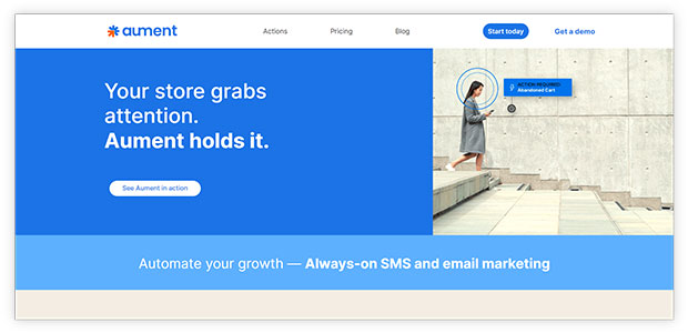 Aument é uma solução de automação de marketing por e-mail, pop-up e SMS. Permite automatizar o acolhimento de novatos, reconquistar clientes em situação de risco, incentivar a segunda compra e recuperar carrinhos abandonados por meio desses canais.