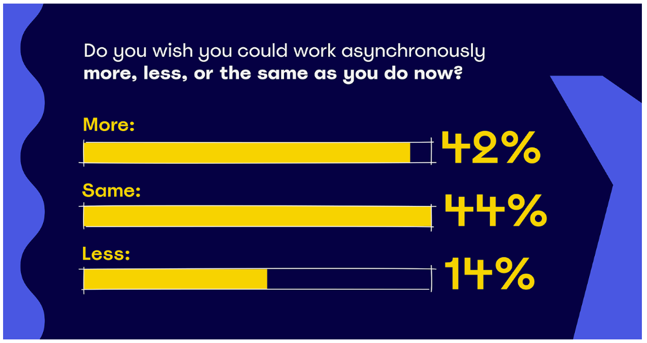 Com a popularidade das reuniões virtuais , as equipes desejam formatos de trabalho mais assíncronos. Um estudo de 2023 descobriu que 42% dos trabalhadores do conhecimento queriam mais deste estilo de trabalho, enquanto apenas 14% desejavam menos. Outras vantagens significativas do trabalho assíncrono incluem a capacidade de minimizar o esgotamento, aumentar a confiança da equipe e aumentar a produtividade.