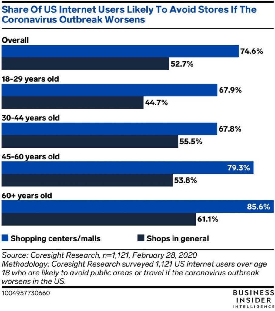 Essa pandemia global também está alimentando uma rápida adoção de compras online entre consumidores mais velhos que são mais vulneráveis ao vírus. Na China, o Alibaba diz que o número de pedidos feitos por pessoas nascidas na década de 1960 quadruplicou este ano em relação ao ano passado. Nos EUA, 9 em cada 10 consumidores com mais de 45 anos dizem que evitarão shopping centers e lojas físicas se o surto piorar. As pessoas mais velhas usarão cada vez mais as lojas online à medida que as taxas de infecção por coronavírus crescem.