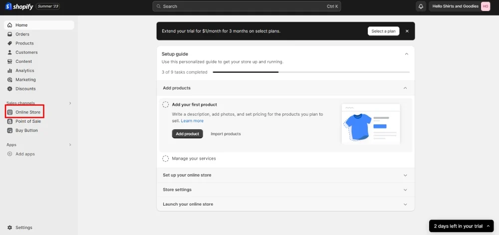Passo 1: Vá para o painel de administração do Shopify. Quando estiver lá, clique em Loja Online .