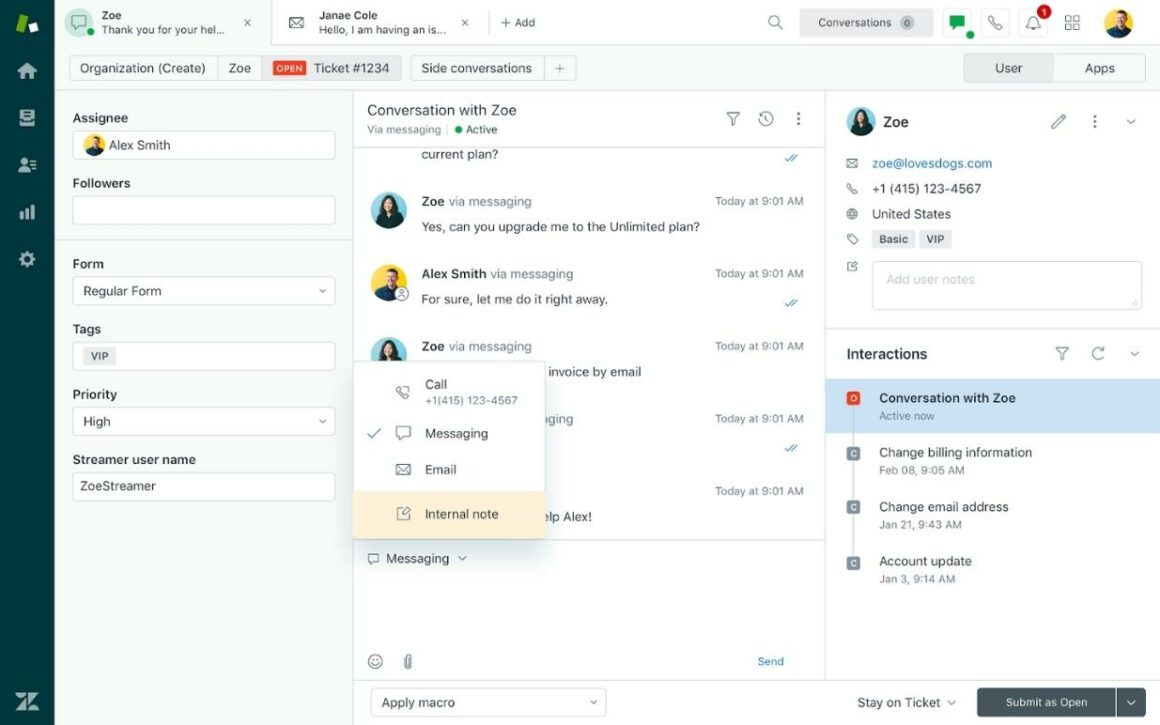 - Sistema de tickets: o Zendesk oferece um sistema robusto de tickets que permite às empresas rastrear e gerenciar consultas de clientes e suporte a tickets com eficiência. Os tickets podem ser categorizados, priorizados e atribuídos a membros específicos da equipe para resolução rápida.