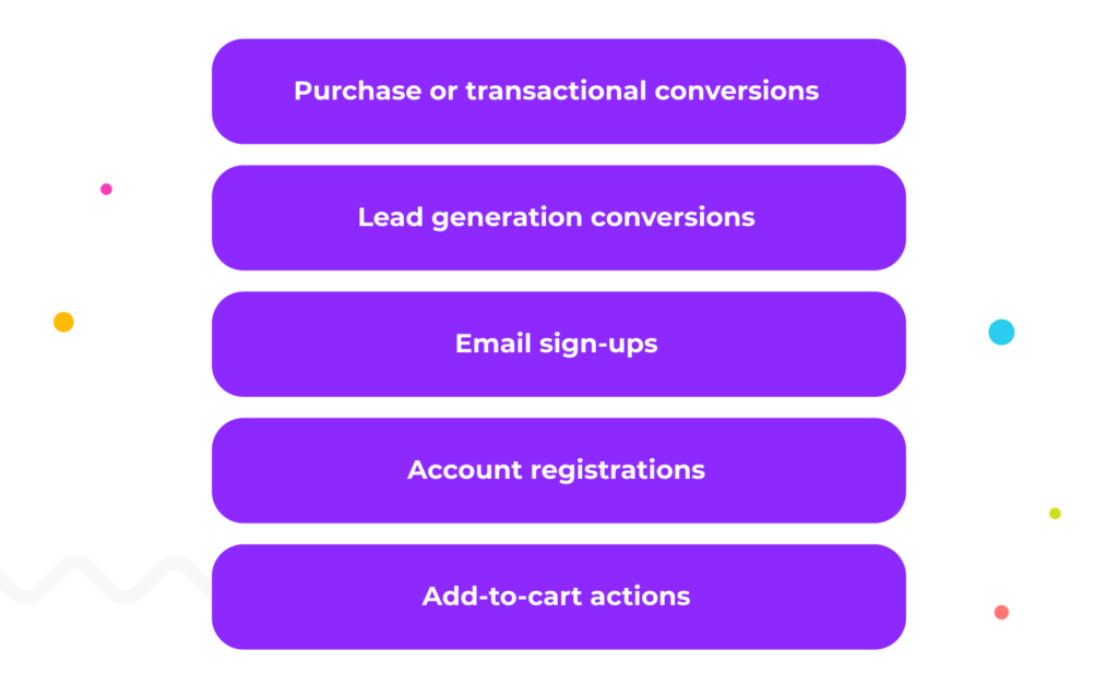 As conversões podem variar dependendo dos objetivos do seu negócio de comércio eletrônico. Alguns tipos comuns de conversões incluem: