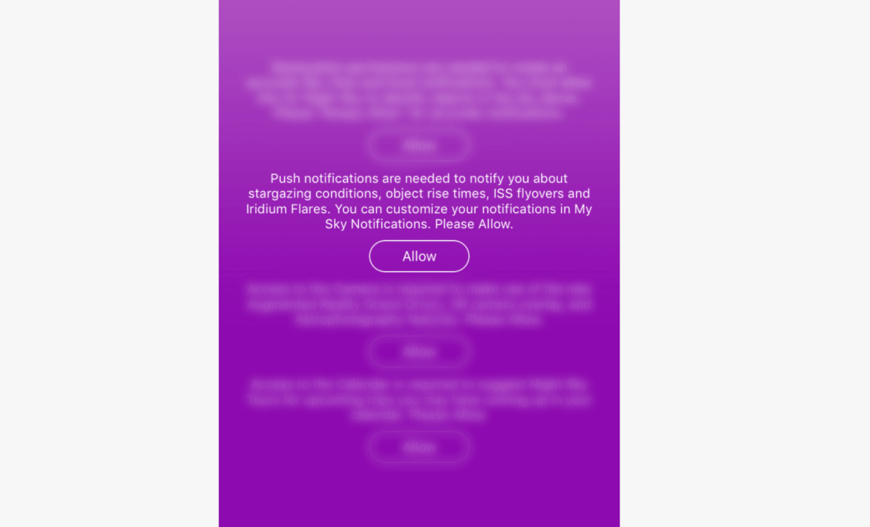 Em vez disso, você deve explicar claramente como o Night Sky faz. Este aplicativo de planetário AR explica sobre o que serão as notificações push. Ao fornecer essas informações antes de solicitar que os destinatários ativem as notificações push, o aplicativo permite que os usuários tomem uma decisão informada.