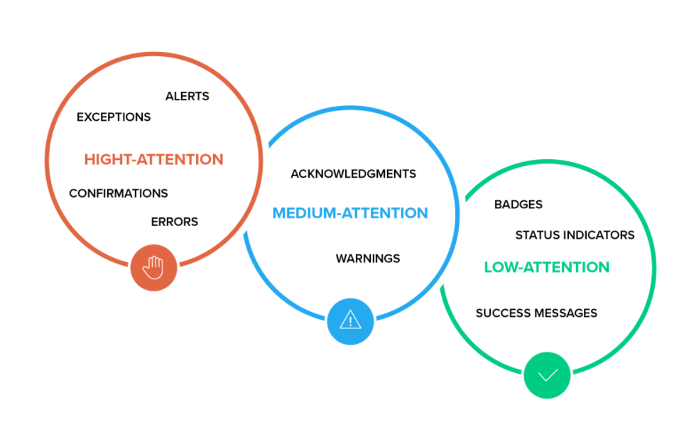 Portanto, a abordagem inicial para o design de notificações push precisa de classificação em três níveis: atenção alta, média e baixa . Depois disso, os tipos de mensagens push precisam ser definidos por atributos específicos nesses três níveis, sejam alertas, confirmações, avisos, erros, mensagens de sucesso ou indicadores de status.
