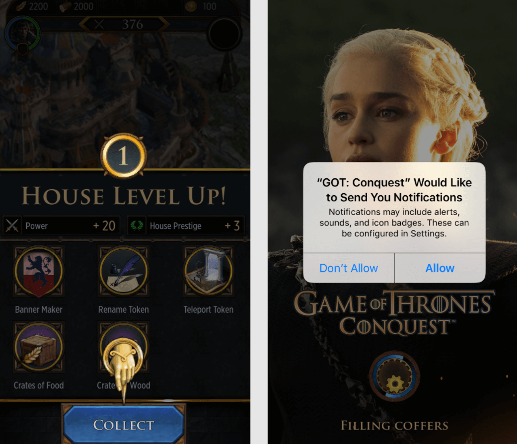 Se alguém instalou seu aplicativo, permita que eles experimentem seu aplicativo e peça que aceitem suas notificações apenas em uma sessão posterior. Por exemplo, o jogo para celular Conquest permite que seus usuários experimentem o aplicativo antes de solicitar que ativem as notificações push. O aplicativo pede aos usuários que ativem as notificações push somente depois que um jogo for experimentado e aumentado de nível pela primeira vez.