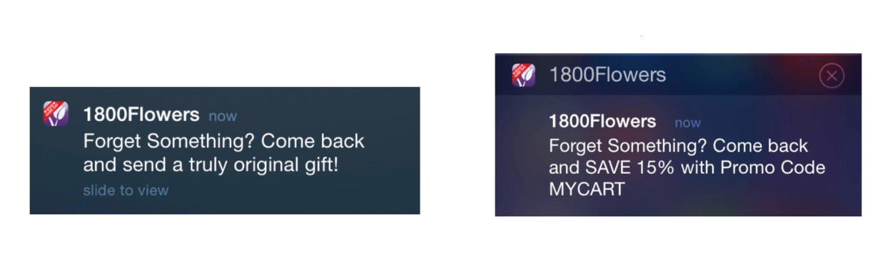 O teste A/B é incrivelmente útil para descobrir qual mensagem funciona melhor para seus usuários. Por exemplo, aproximando-se do Dia dos Namorados, 1-800-Flowers preparou duas mensagens diferentes para o teste A/B. Eles testaram duas versões de uma notificação push para uma pequena amostra de clientes que adicionaram um item aos carrinhos, mas não concluíram suas compras.